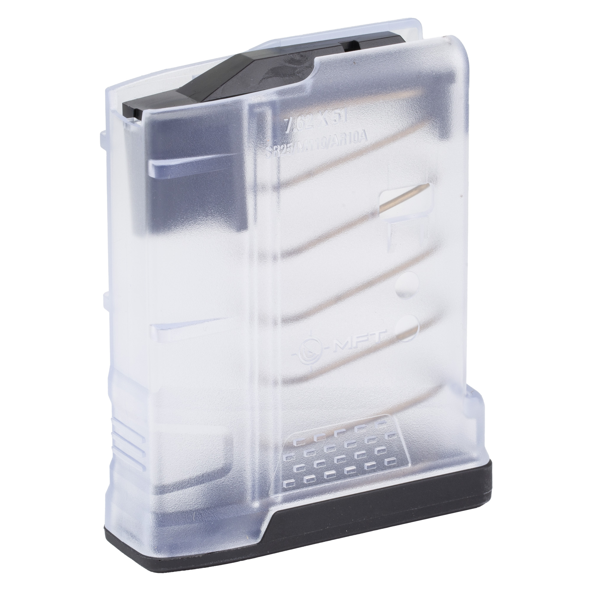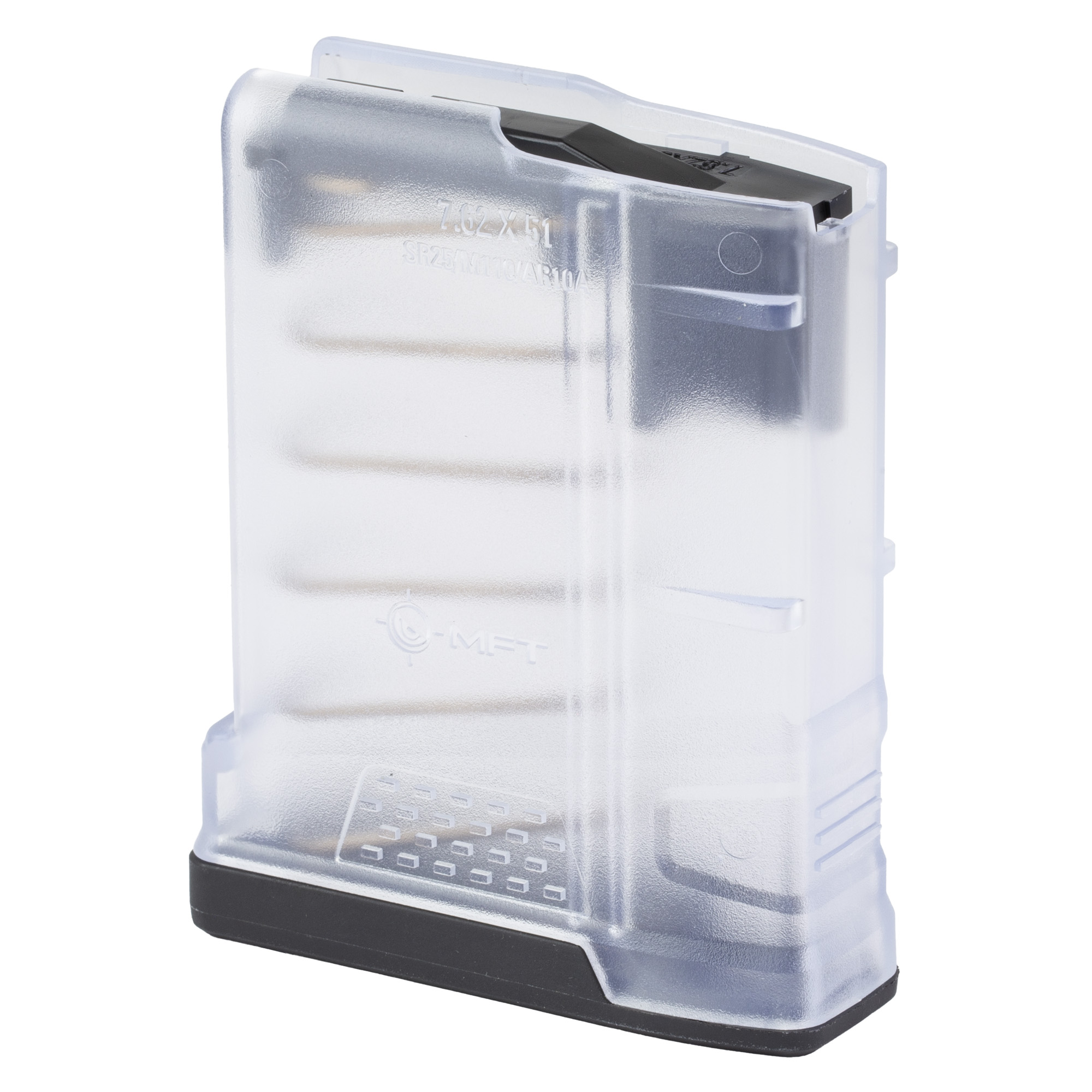 Clear visual confirmation of round count and ammo type, textured to eliminate shine. Designed for the AR10A/SR25/M110 pattern rifles. Optimized for use with SAAMI-spec 7.62×51/.308 Winchester ammunition. Utilizing material technology and manufacturing processes for enhanced strength, durability, and reliability to exceed demanding military performance specs.