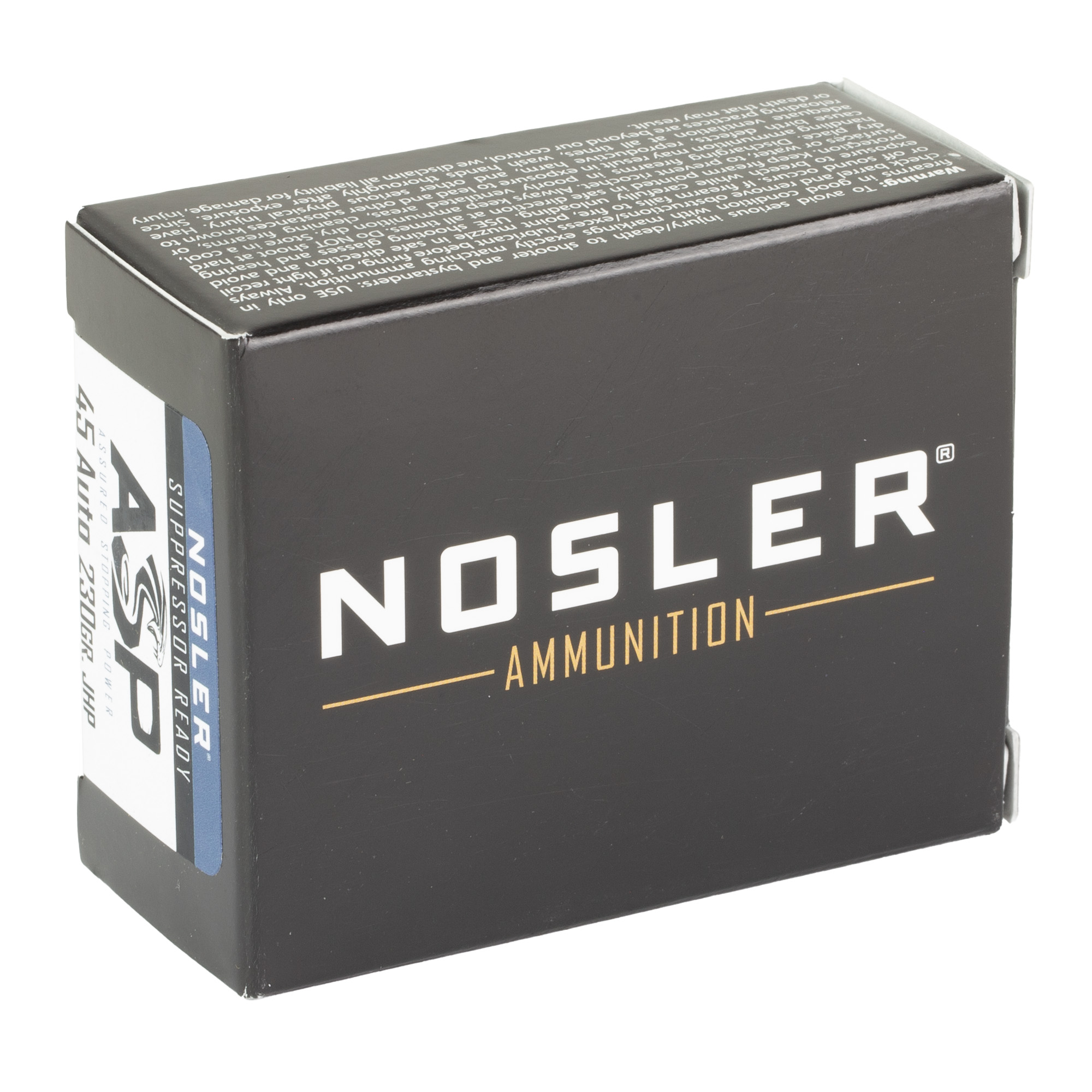 Nosler Assured Stopping Power (ASP) ammunition line combines match-grade accuracy with a reliable, effective, hollow-point bullet. Evolving from the Match Grade ammunition line, ASP ammunition is loaded with the same quality and attention to detail that Match Grade users have come to expect, with the addition of an expanding hollow-point bullet designed specifically for duty and defensive use. Loaded in Nosler headstamped brass, and utilizing quality components throughout, the ASP ammunition can be relied upon to perform in a wide variety of applications and ranges. Equally at home on duty or in a defensive role, Law Enforcement professionals and civilians alike can rest assured that ASP ammunition will perform when needed.