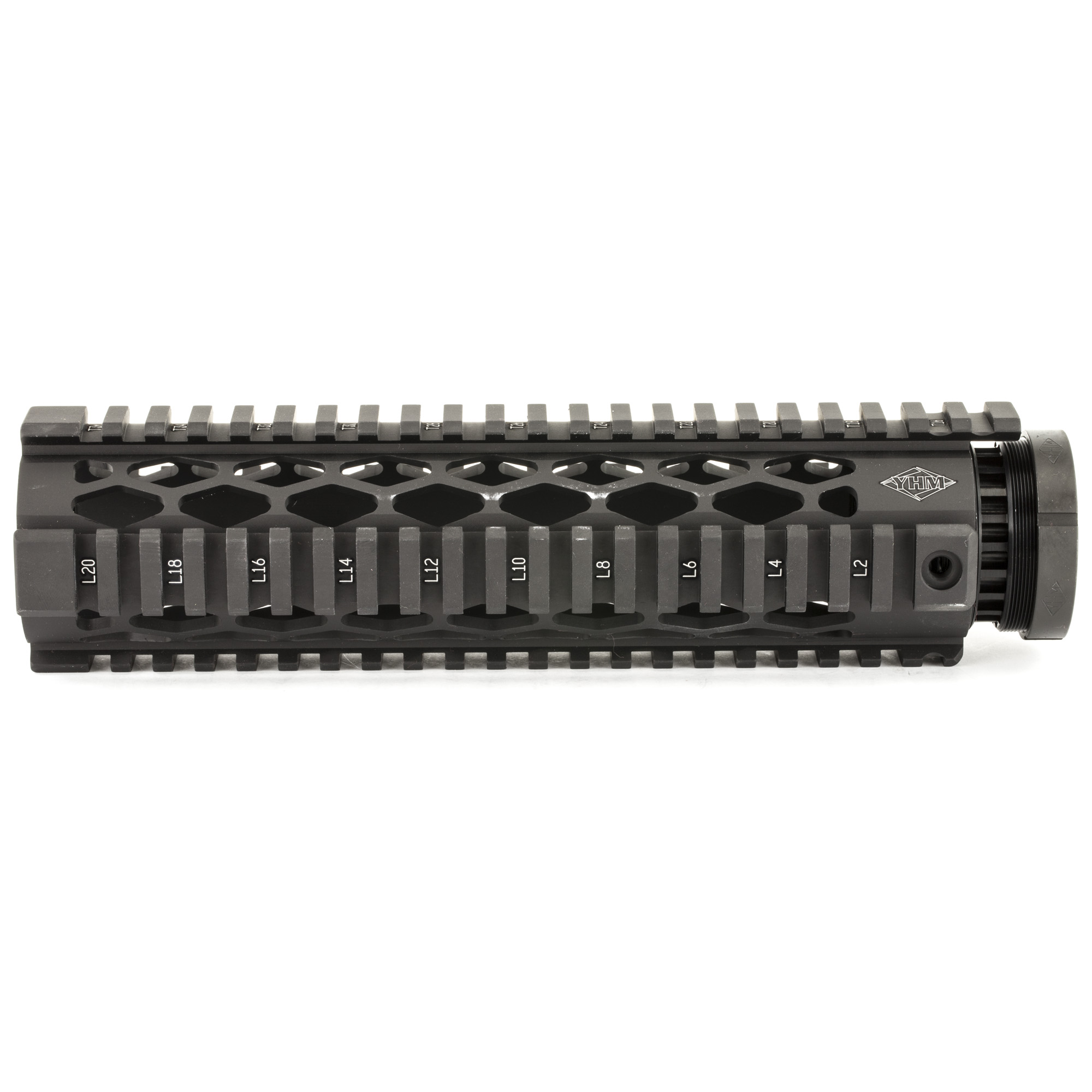 These unique forearms feature diamond shaped heat vents, an extended top rail for gap-free installation, T marked rails to mark accessory locations, they accept their end caps, and utilize their anti-rotation screws for secure installation. The forearms and barrel nuts are made of 6061-T6 aluminum and hardcoated to military specifications. The jam nut and anti-rotation screws are steel and plated a matte black finish to match.